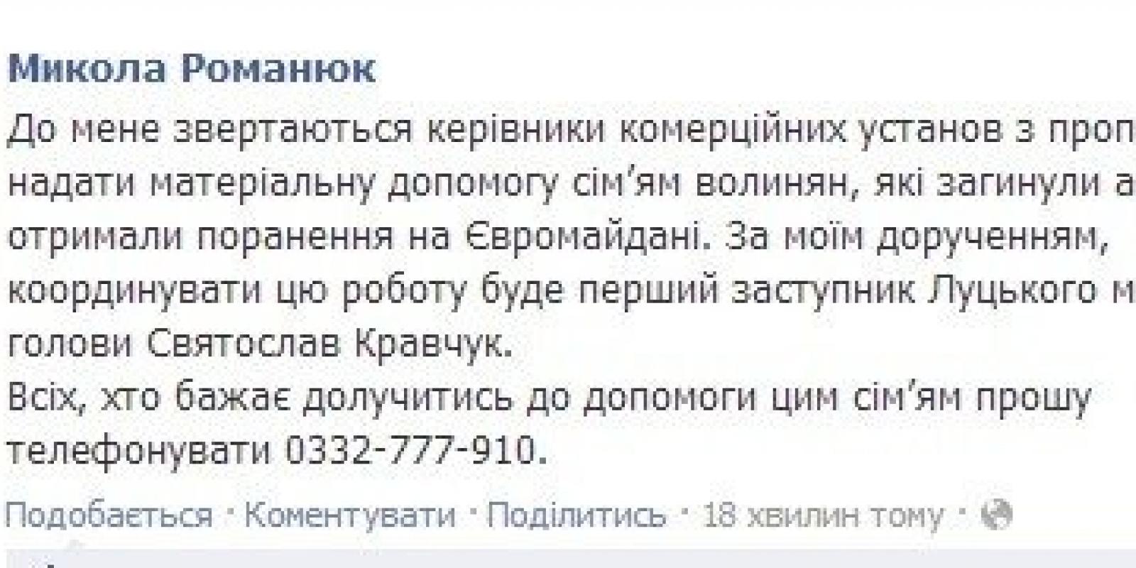 До мера Луцька Миколи Романюка звертаються місцеві підприємці, які хочуть надати матеріальну допомогу сім'ям загиблих на Майдані волинян. Про це Микола Романюк написав на своїй сторінці у Facebook.