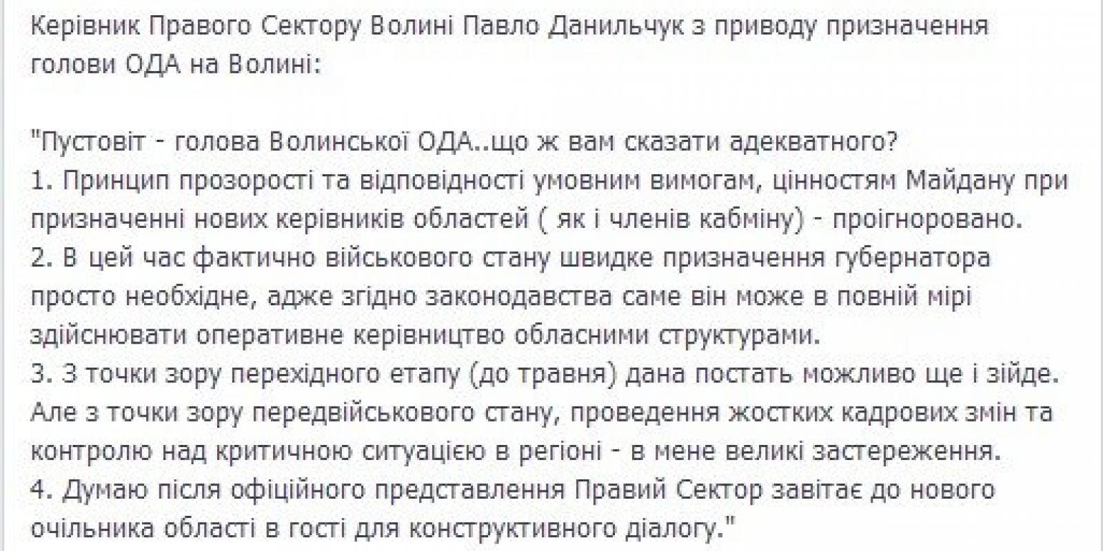 «Керівник Правого Сектору Волині Павло Данильчук з приводу призначення голови ОДА на Волині: