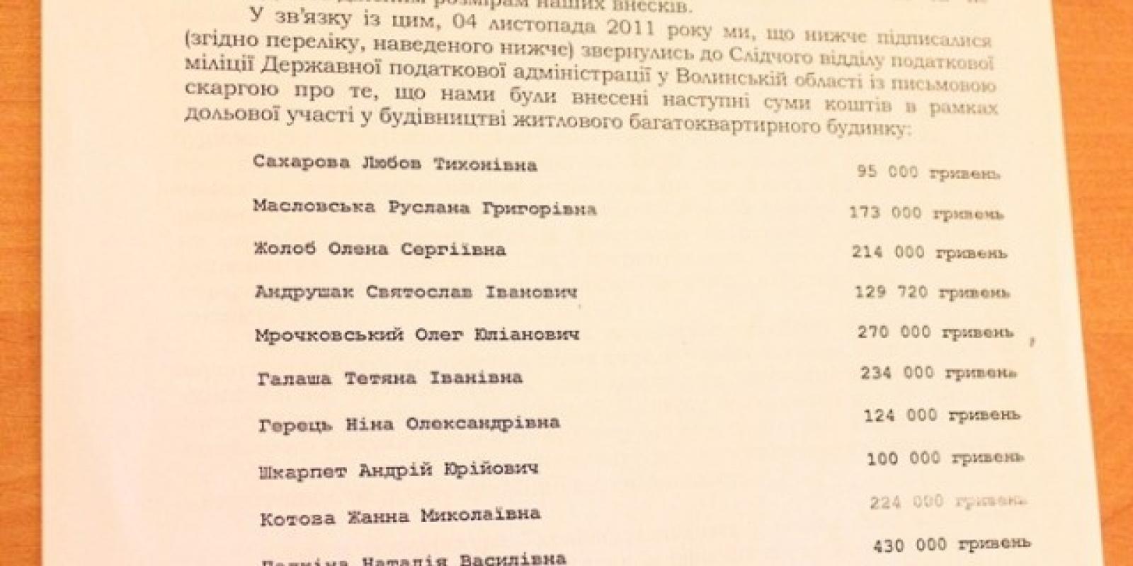 До прикладу, зі слів постраждалих, серед ошуканих волинян є жінка, яка усиновила двох дітей й хотіла покращити умови проживання для своїх чад. Утім, тепер сім’я опинилась на вулиці, адже попередню квартиру вони продали, аби вкласти гроші у нове, просторе житло.