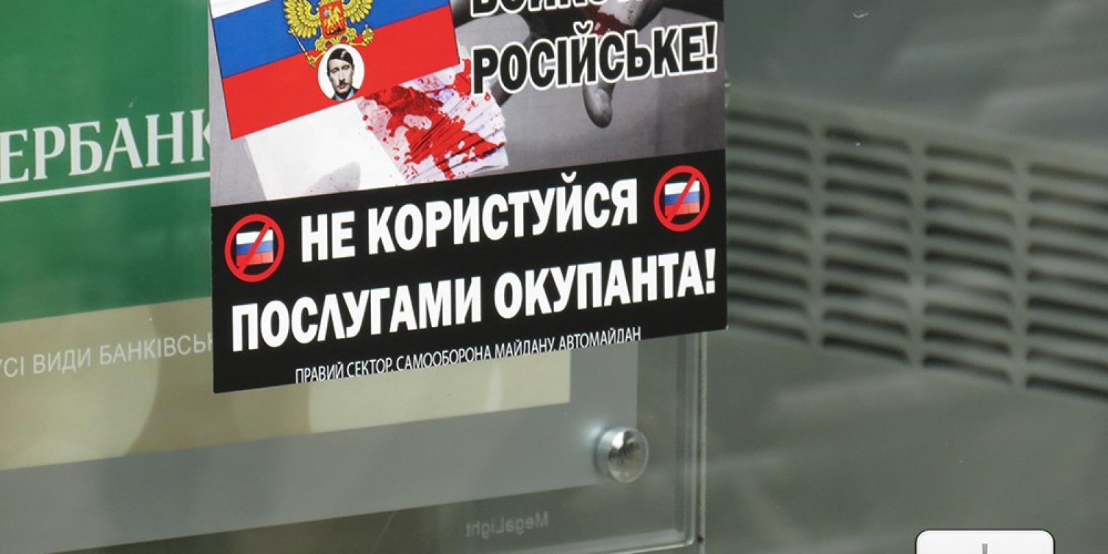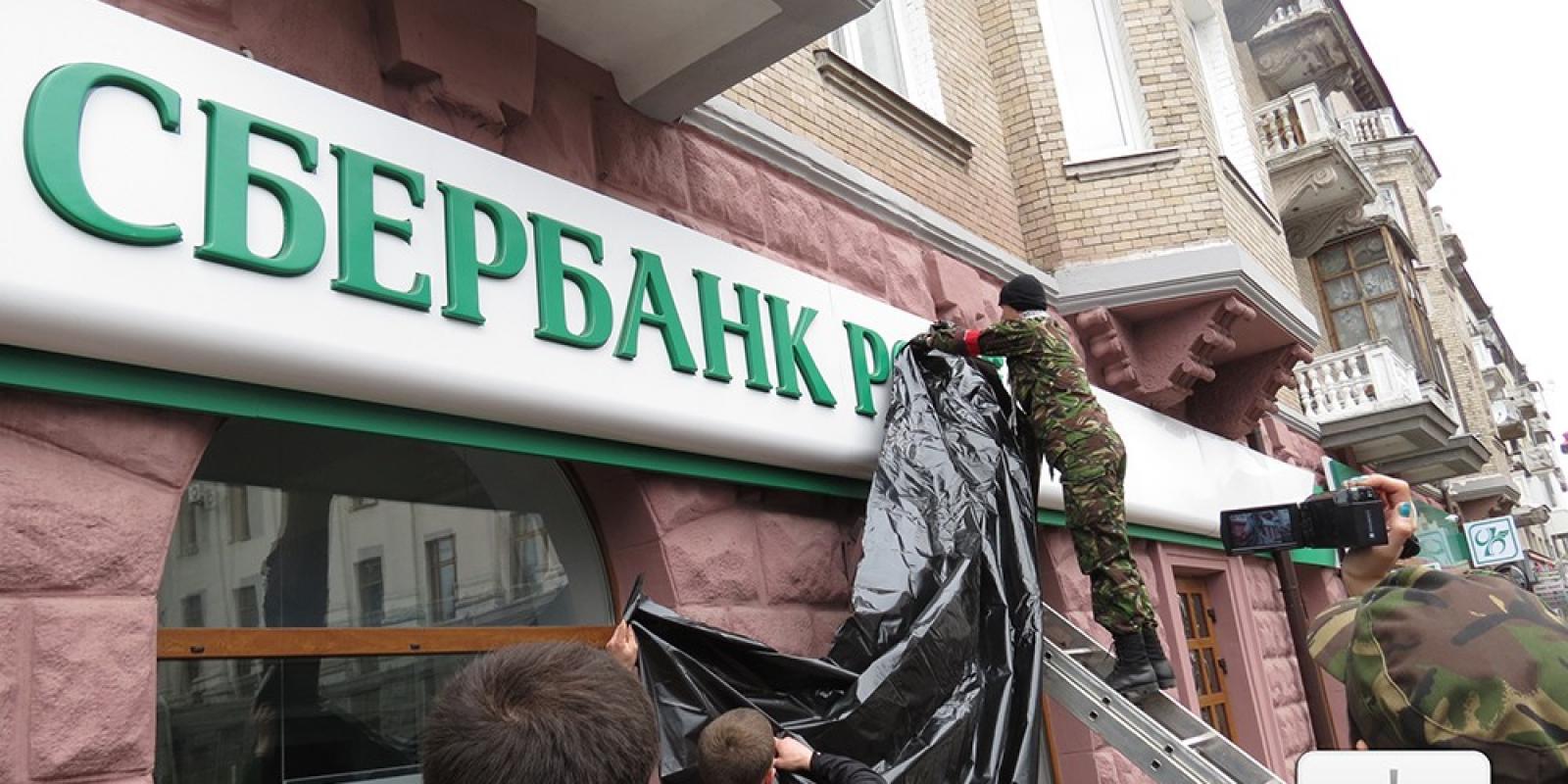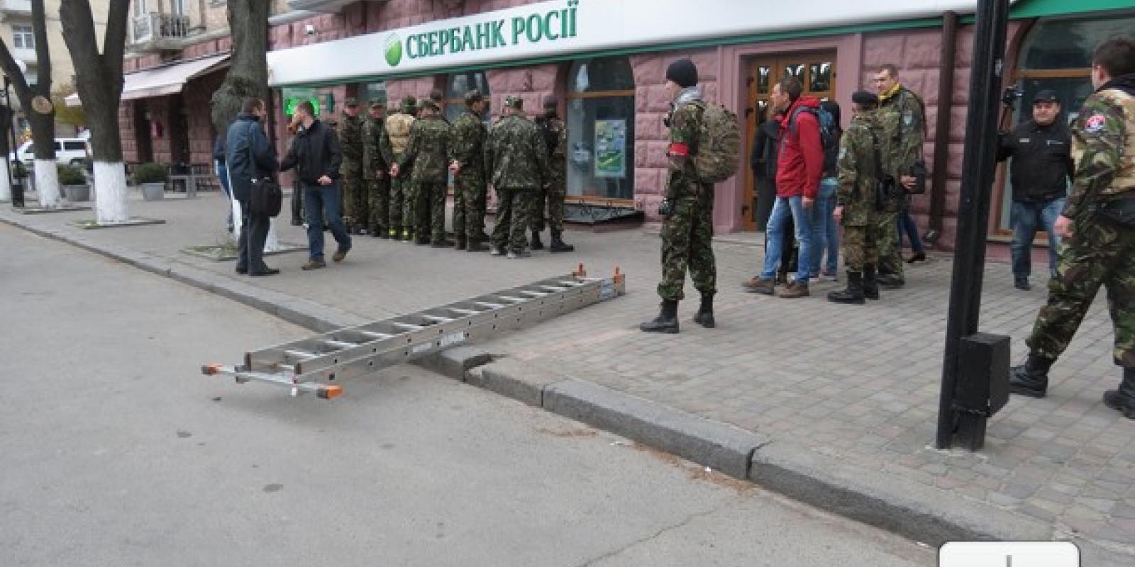 Першим банком до якого «навідались» протестуючі став державний банк Російської Федерації «Сбербанк Росії». Координатор «Правого сектору» Павло Данильчук озвучив вимоги до керівництва банку, які полягали у тому, аби банк призупинив свою діяльність.