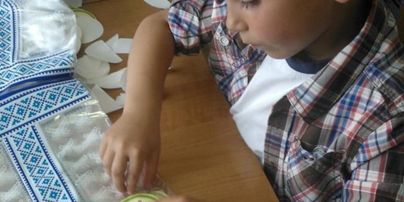 На третьому: Син Гліб клеїть наліпку «10 копійок на добро» на упаковки для хліба "Родинний" від "ТЕРЕМНО ХЛІБ"